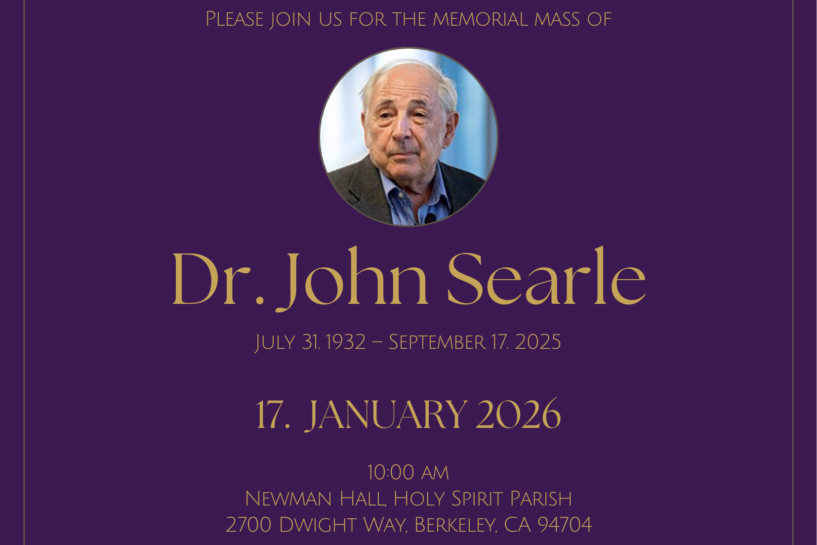 Please join us for a Memorial Mass for Dr. John Searle on January 17th, 2026. The Mass will be celebrated at the Newman Hall Holy Spirit Parish at 10:00 am.
