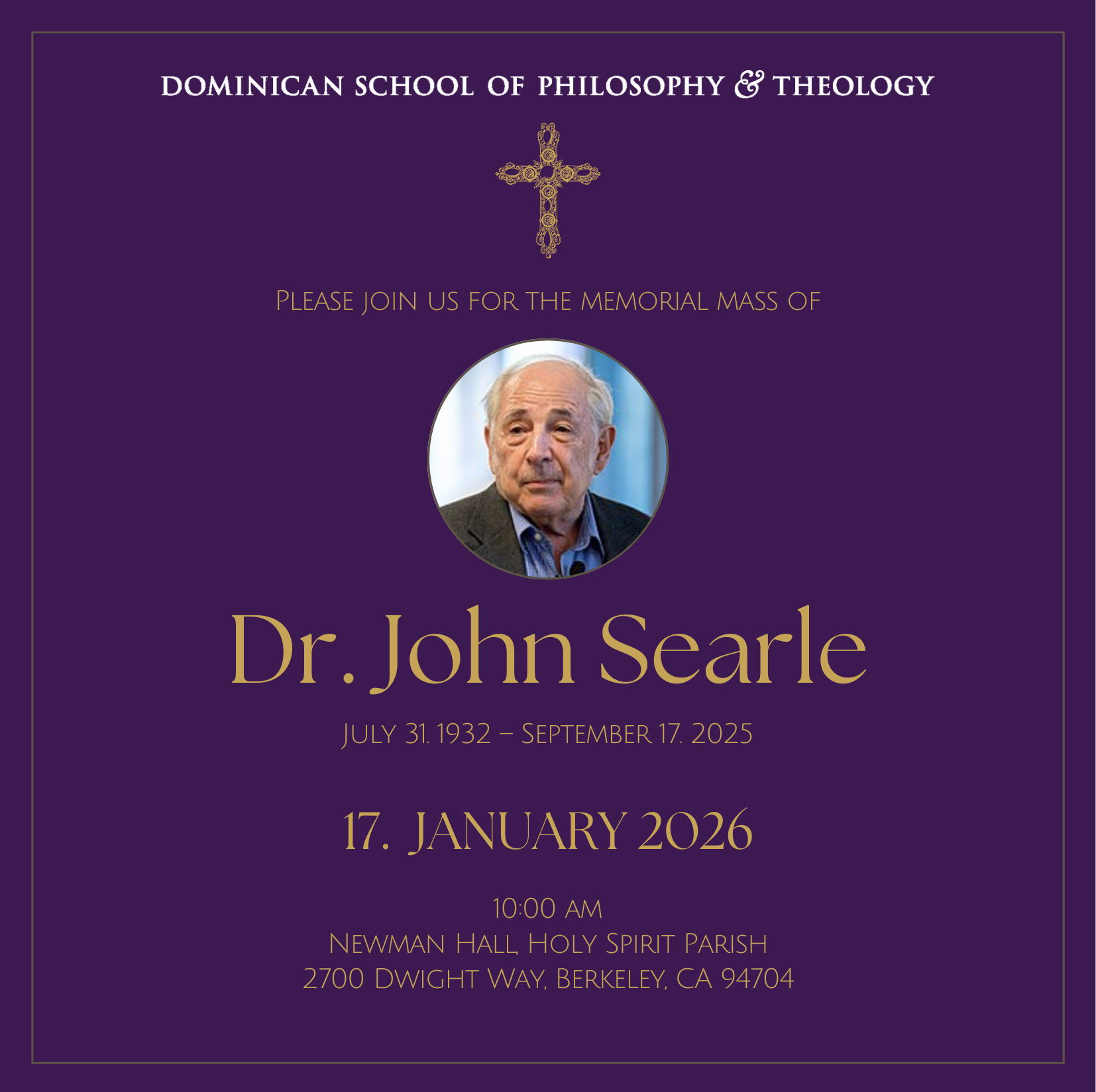 Please join us for the Memorial Mass for Dr. John Searle on January 17th, 2026. The Mass will be celebrated at the Newman Hall Holy Spirit Parish at 10:00 am.